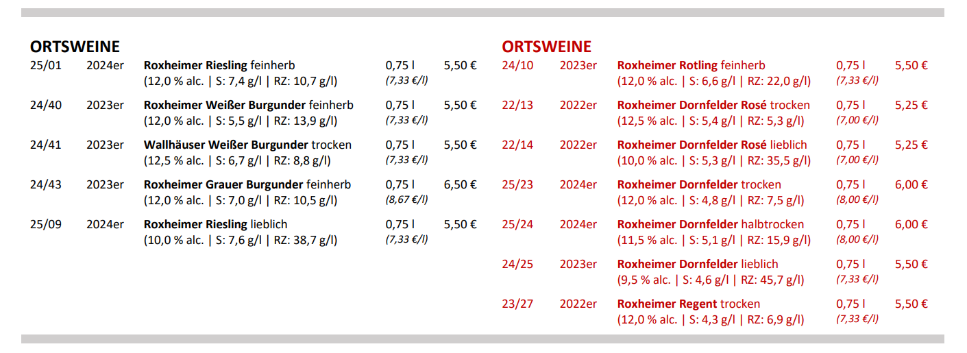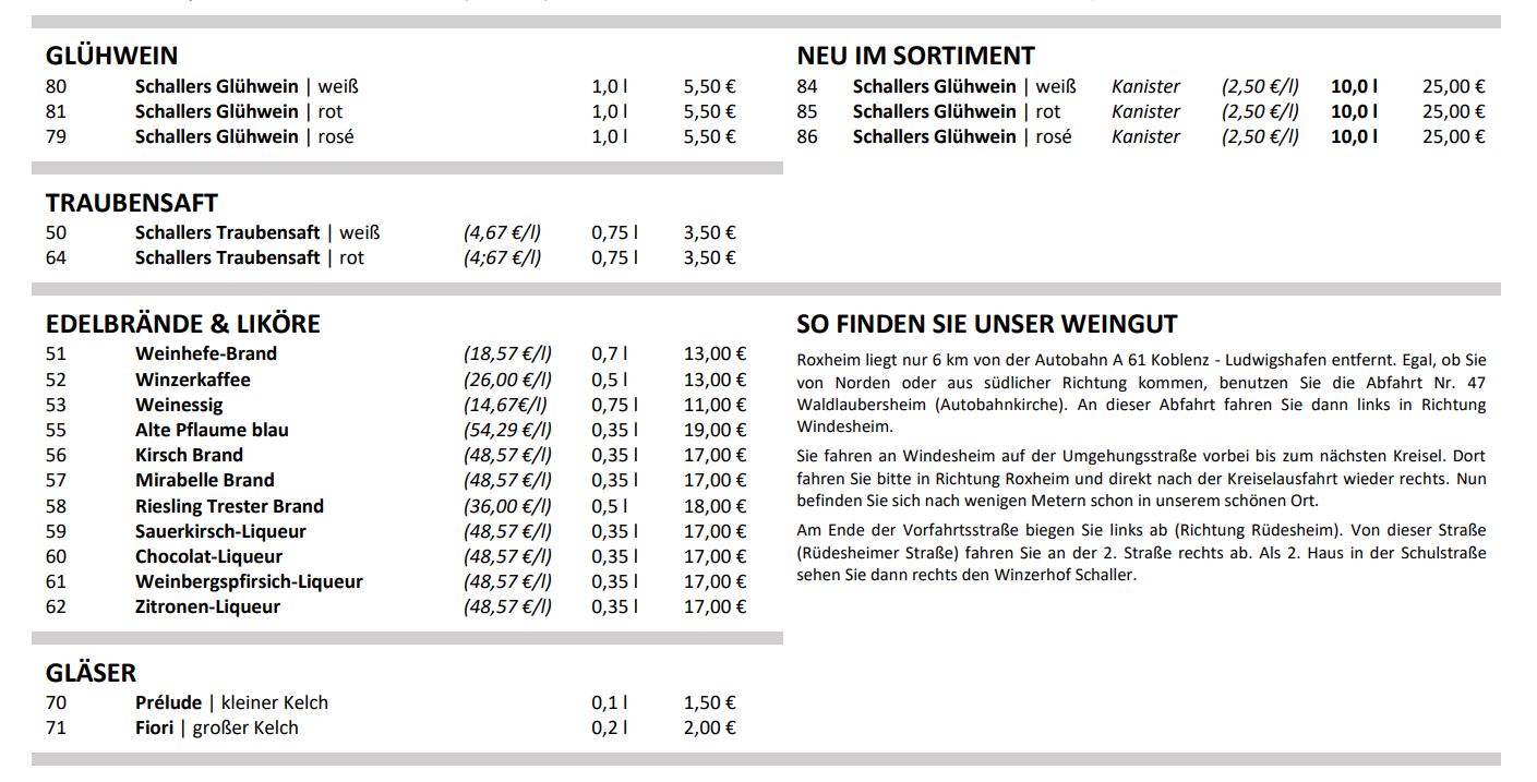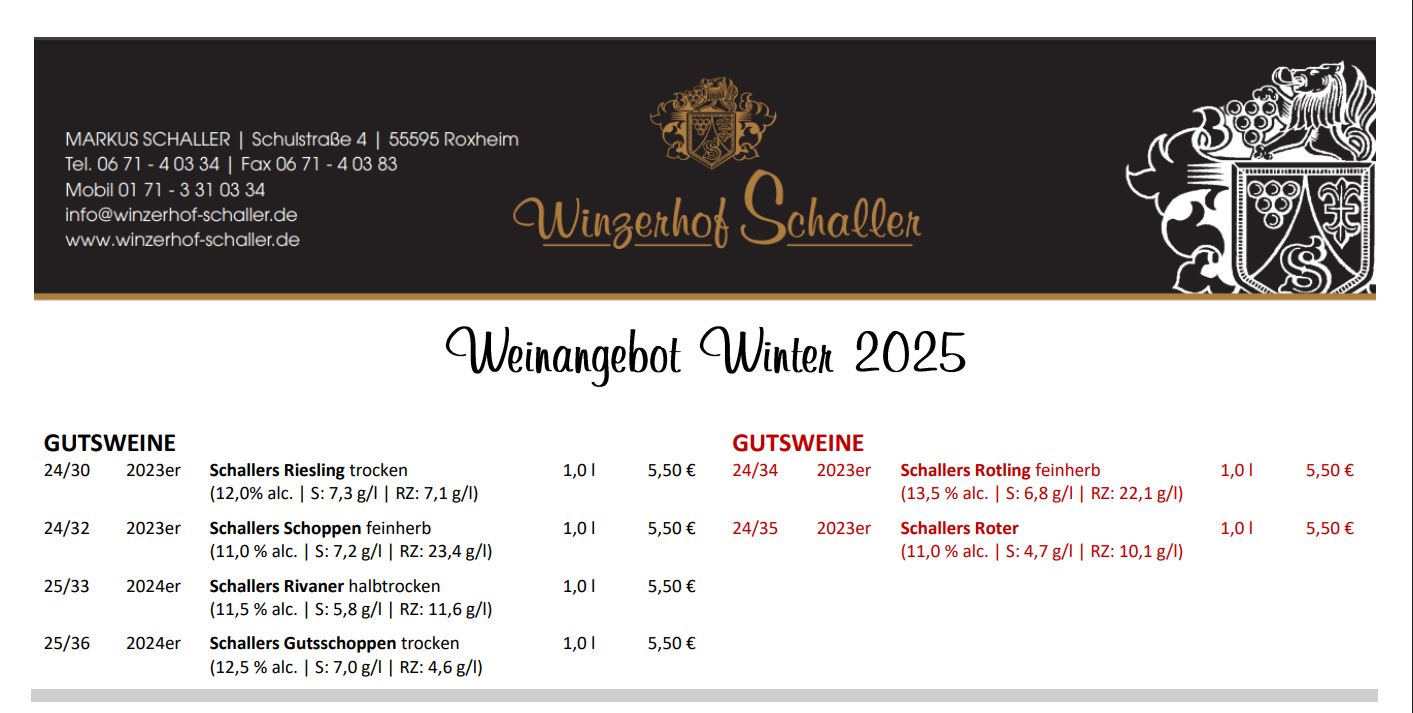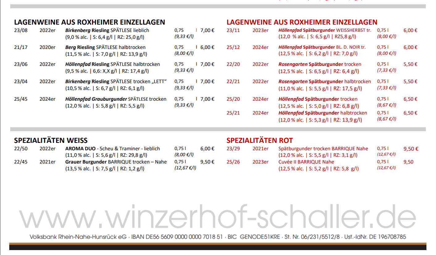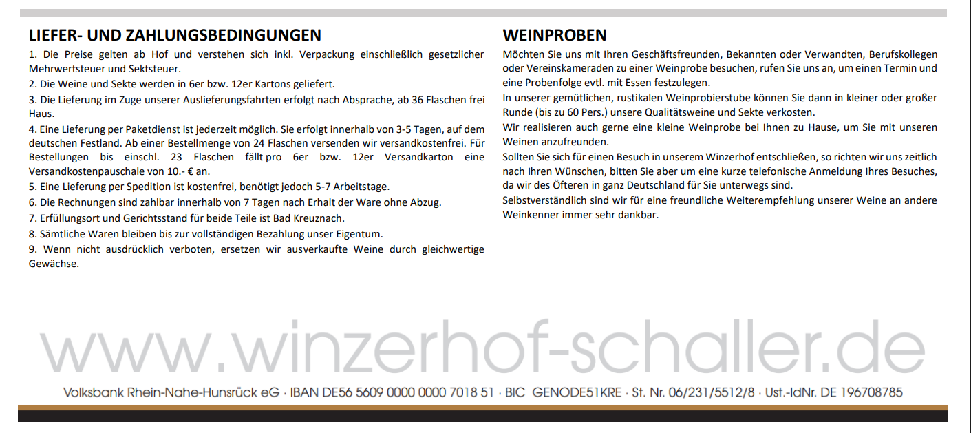 Das Kleingedruckte | Lieferung innerhalb 3-5 Werktagen. Dies gilt für Lieferungen auf das dt. Festland. Bitte beachten Sie unsere Liefer- und Versandbedingungen sowie die Allgemeinen Geschäftsbedingungen (AGB). | Enthält Sulfite | Verantwortlicher Lebensmittelunternehmer gemäß Art. 8 Abs. 1 LMIV ist der Winzerhof Schaller, Schulstraße 4, 55595 Roxheim, Deutschland.